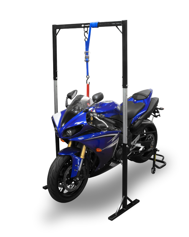 Struttura alzamoto da officina. Permette, grazie a cinghie di fissaggio di sospendere la moto ad una altezza regolabile compresa tra 170 cm e 190 cm.