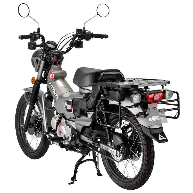 Side bag support for CT125. Protects side bags from wrapping around tires and heat from mufflers. Lightweight and rigid 16mm diameter hollow pipe is used for the outer frame. The surface is finished with black powder coating to resist rust and abrasion. Separate left and right side design allows for mounting on only one side.
