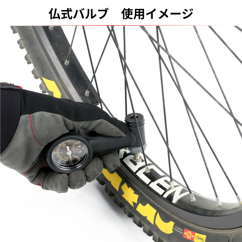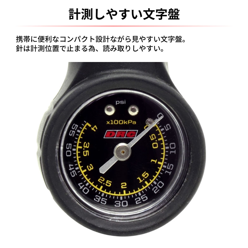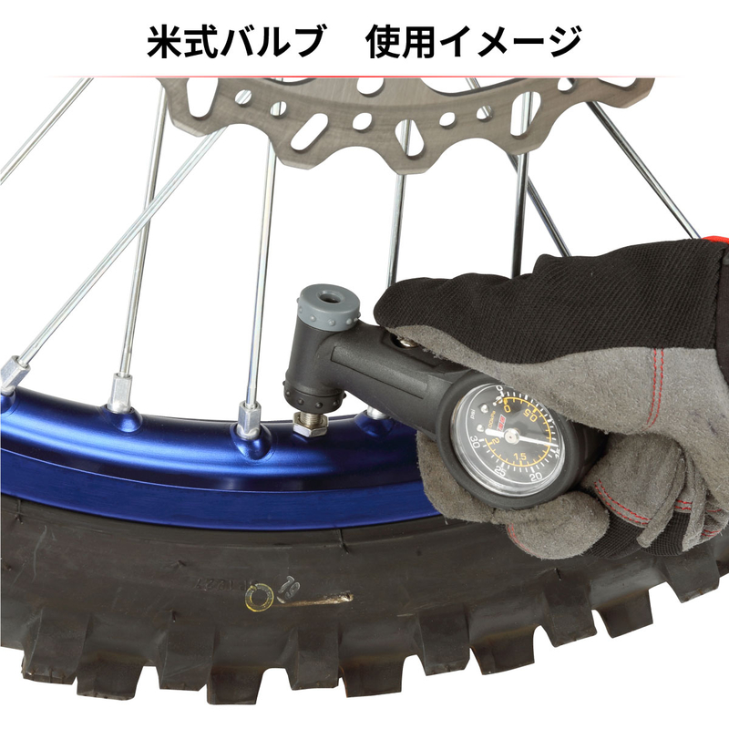 Air gauge for motorcycles and MTB. Easy-to-read dial with a compact design that is convenient for carrying. The needle stops at the measurement position for easy reading. Equipped with micro-adjust button for pressure reduction adjustment.