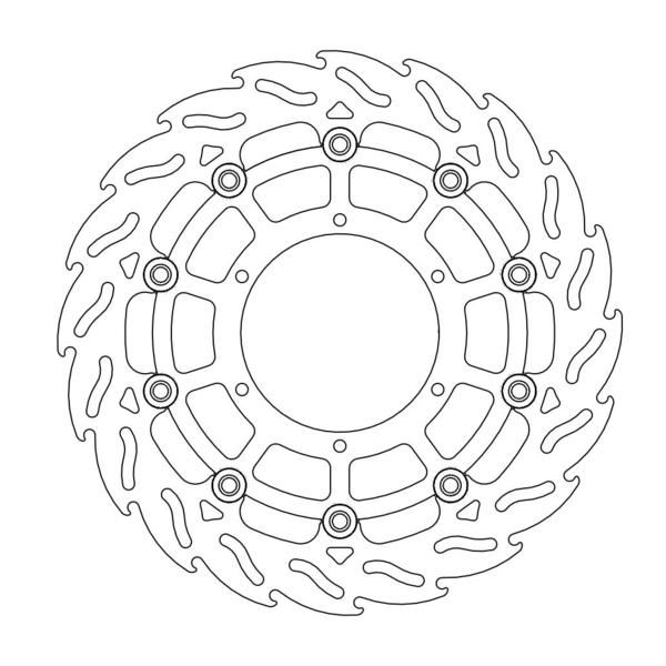 Questo disco flottante con rotore inacciaio anodizzato di colore nero o o argento. Con il famoso disegno a fiamma che ne aumenta il raffreddamento. Compatibile con la pinza freno originale
