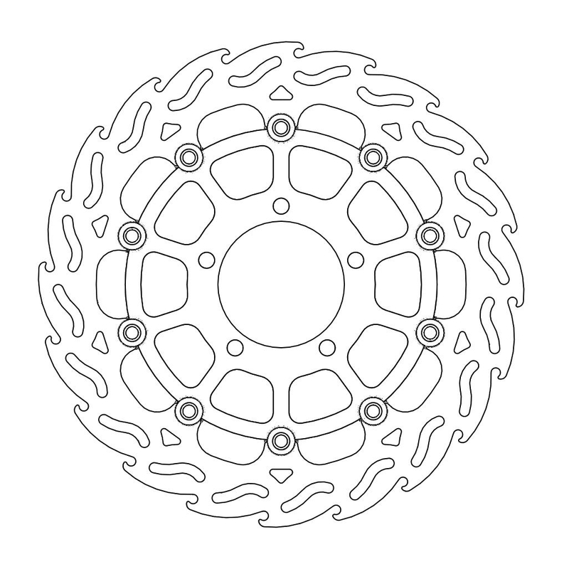 Questo disco flottante con rotore inacciaio anodizzato di colore nero o o argento. Con il famoso disegno a fiamma che ne aumenta il raffreddamento. Compatibile con la pinza freno originale