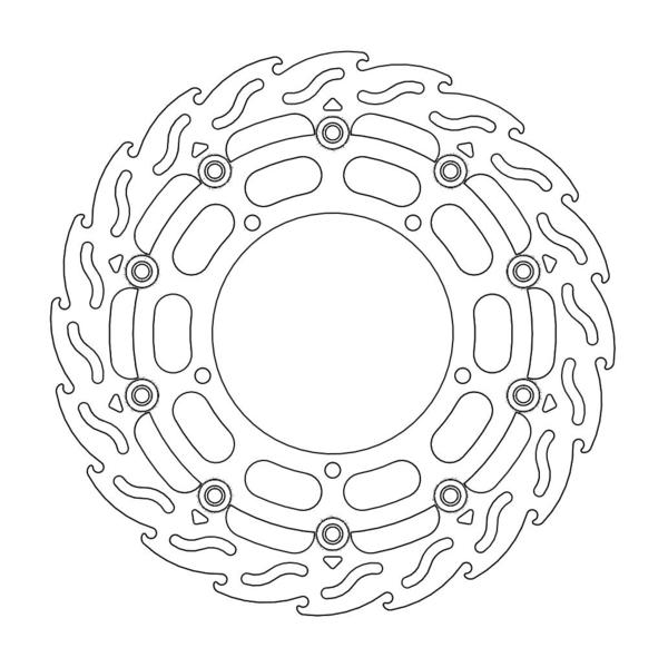 Questo disco flottante con rotore inacciaio anodizzato di colore nero o o argento. Con il famoso disegno a fiamma che ne aumenta il raffreddamento. Compatibile con la pinza freno originale
