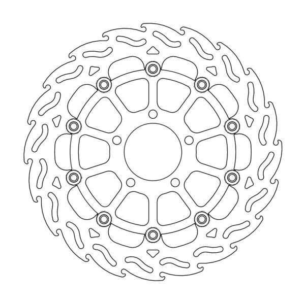 Questo disco flottante con rotore inacciaio anodizzato di colore nero o o argento. Con il famoso disegno a fiamma che ne aumenta il raffreddamento. Compatibile con la pinza freno originale