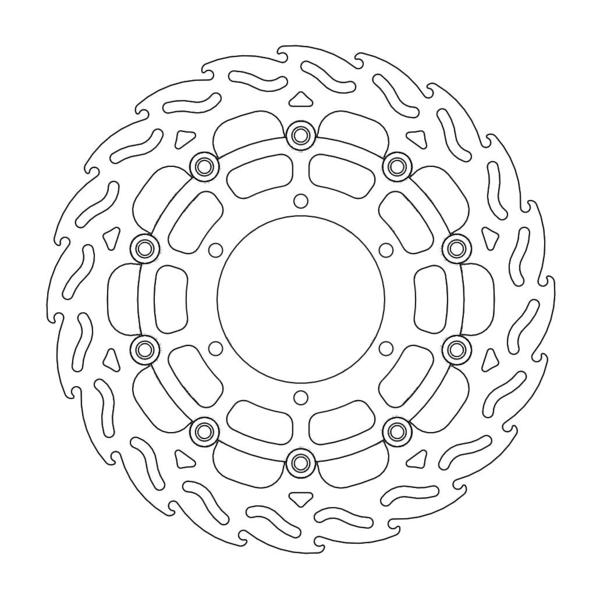 Questo disco flottante con rotore inacciaio anodizzato di colore nero o o argento. Con il famoso disegno a fiamma che ne aumenta il raffreddamento. Compatibile con la pinza freno originale