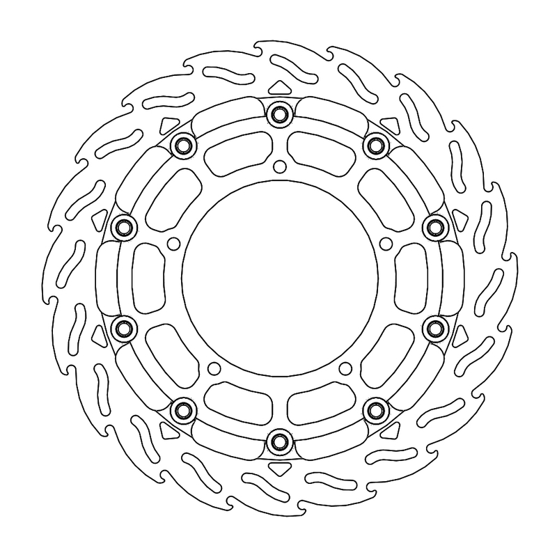 Questo disco flottante con rotore inacciaio anodizzato di colore nero o o argento. Con il famoso disegno a fiamma che ne aumenta il raffreddamento. Compatibile con la pinza freno originale