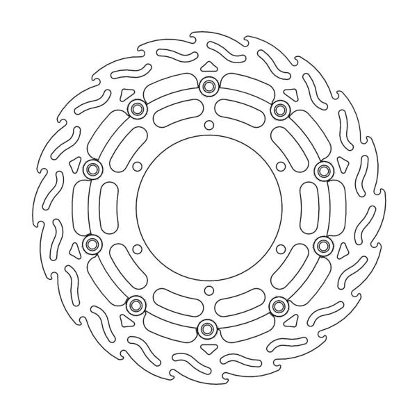 Questo disco flottante con rotore inacciaio anodizzato di colore nero o o argento. Con il famoso disegno a fiamma che ne aumenta il raffreddamento. Compatibile con la pinza freno originale