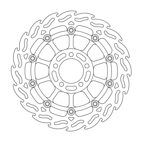 Disco da 320/300 specifico per le Motard da gara e' realizzato con mat eriali di qualita' superiore e garantisce le massime prestazioni. Questo disco flottante da 320 mm con rotore interno in acciaio anodizzato nero o argento e' progettato per e ssere utilizzato con la pinza Supermoto Racing. Lo spessore del disco e' stato portato a 5mm per contrastare i fenomeni di deformazioni dovuti al calore. Non compatibile con la pinza freno originale. E' stato sviluppato anche un disco da 320mm per la versione stradale che monta con pinza e pompa originale