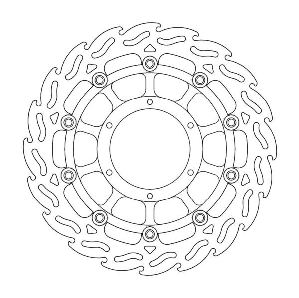 Disco da 320/300 specifico per le Motard da gara e' realizzato con mat eriali di qualita' superiore e garantisce le massime prestazioni. Questo disco flottante da 320 mm con rotore interno in acciaio anodizzato nero o argento e' progettato per e ssere utilizzato con la pinza Supermoto Racing. Lo spessore del disco e' stato portato a 5mm per contrastare i fenomeni di deformazioni dovuti al calore. Non compatibile con la pinza freno originale. E' stato sviluppato anche un disco da 320mm per la versione stradale che monta con pinza e pompa originale