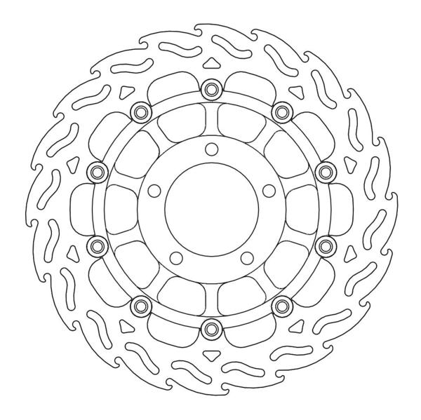 Disco da 320/300 specifico per le Motard da gara e' realizzato con mat eriali di qualita' superiore e garantisce le massime prestazioni. Questo disco flottante da 320 mm con rotore interno in acciaio anodizzato nero o argento e' progettato per e ssere utilizzato con la pinza Supermoto Racing. Lo spessore del disco e' stato portato a 5mm per contrastare i fenomeni di deformazioni dovuti al calore. Non compatibile con la pinza freno originale. E' stato sviluppato anche un disco da 320mm per la versione stradale che monta con pinza e pompa originale