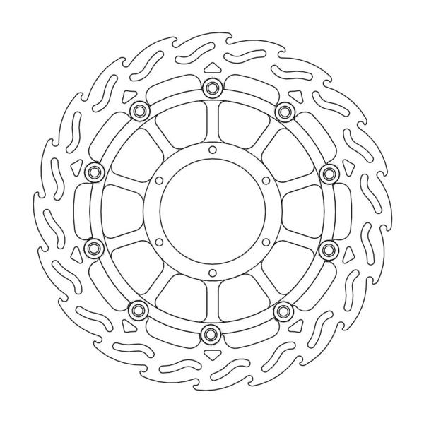 Disco da 320/300 specifico per le Motard da gara e' realizzato con mat eriali di qualita' superiore e garantisce le massime prestazioni. Questo disco flottante da 320 mm con rotore interno in acciaio anodizzato nero o argento e' progettato per e ssere utilizzato con la pinza Supermoto Racing. Lo spessore del disco e' stato portato a 5mm per contrastare i fenomeni di deformazioni dovuti al calore. Non compatibile con la pinza freno originale. E' stato sviluppato anche un disco da 320mm per la versione stradale che monta con pinza e pompa originale