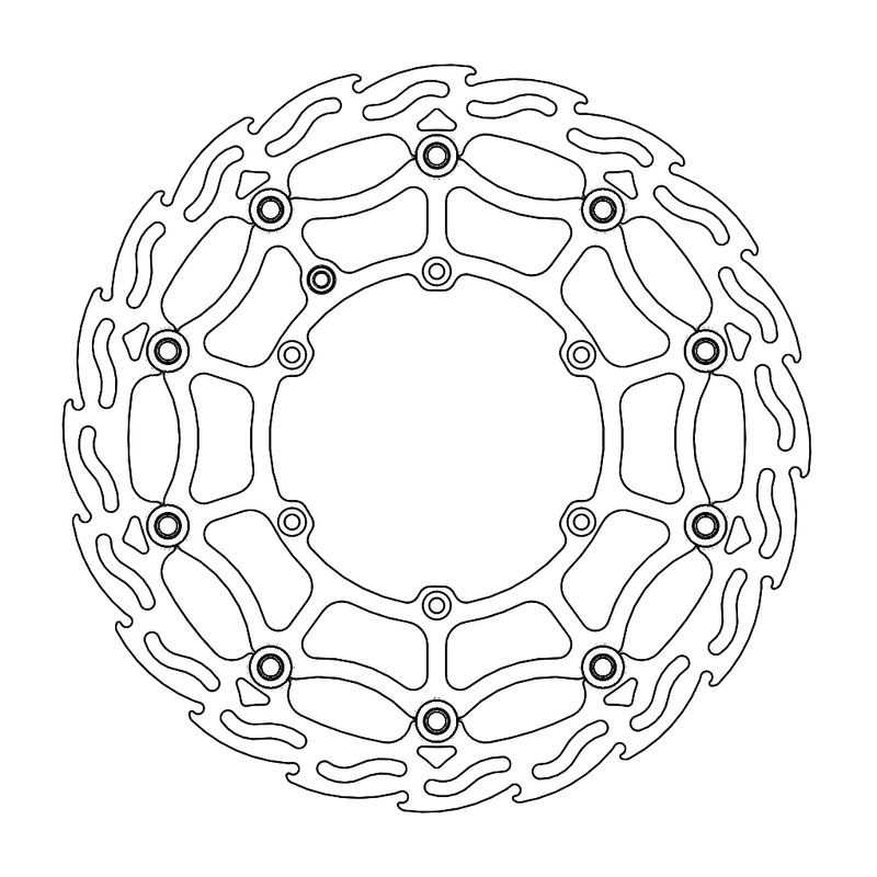 Costruiti con acciaio di derivazione aereonautica, diametro esterno maggiorato disponibili sia da 260 che da270 mm, tagliati al laser e lavorati con macchine ad alta precisione CNC, vengono rettificati e trattati termicamente per resistere al calore, alla deformazione e alla corrosione. Il particolare disegno delle zone di alleggerimento consente un apprezzabile riduzione di peso e l'annullamento del'effetto giroscopico dovuto alla maggiorazione del diametro esterno. I nottolini di collegamento (costruiti in ergal con ossidazione dura) di ultima generazione consentono il reale adattamento della pista frenante per permettere la completa efficienza del sistema, garantendo prestazioni costanti anche in condizioni di utilizzo severe. Per il loro utilizzo e' necessario riposizionare la pinza freno tramite lo specifico supporto pinza MOTOMASTER.