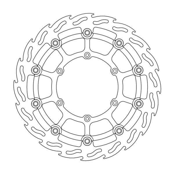 Disco da 320/300 specifico per le Motard da gara e' realizzato con mat eriali di qualita' superiore e garantisce le massime prestazioni. Questo disco flottante da 320 mm con rotore interno in acciaio anodizzato nero o argento e' progettato per e ssere utilizzato con la pinza Supermoto Racing. Lo spessore del disco e' stato portato a 5mm per contrastare i fenomeni di deformazioni dovuti al calore. Non compatibile con la pinza freno originale. E' stato sviluppato anche un disco da 320mm per la versione stradale che monta con pinza e pompa originale