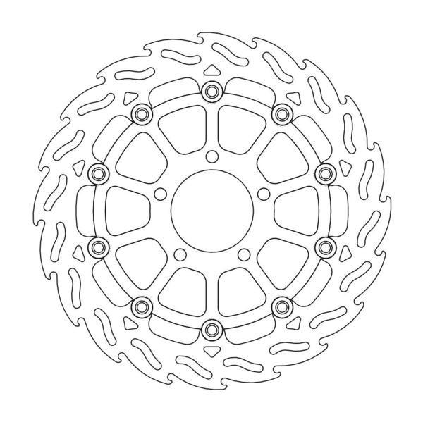 Questo disco flottante con rotore inacciaio anodizzato di colore nero o o argento. Con il famoso disegno a fiamma che ne aumenta il raffreddamento. Compatibile con la pinza freno originale