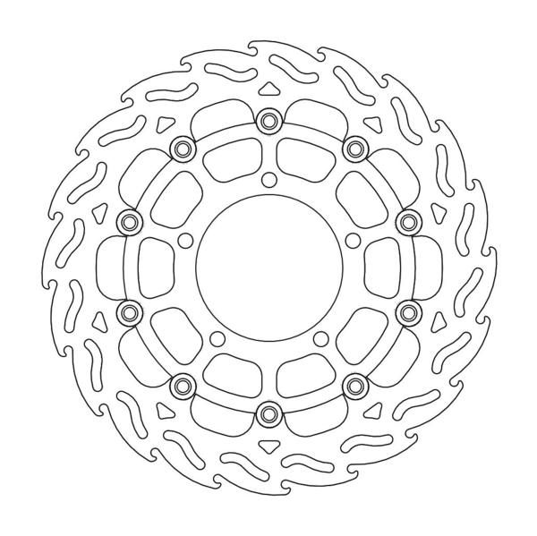 Questo disco flottante con rotore inacciaio anodizzato di colore nero o o argento. Con il famoso disegno a fiamma che ne aumenta il raffreddamento. Compatibile con la pinza freno originale