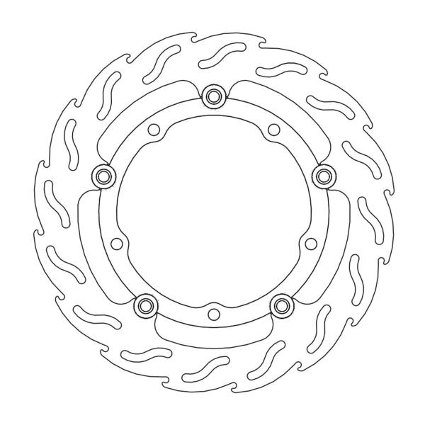 Questo disco flottante con rotore inacciaio anodizzato di colore nero o o argento. Con il famoso disegno a fiamma che ne aumenta il raffreddamento. Compatibile con la pinza freno originale