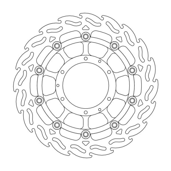 Questo disco flottante con rotore inacciaio anodizzato di colore nero o o argento. Con il famoso disegno a fiamma che ne aumenta il raffreddamento. Compatibile con la pinza freno originale