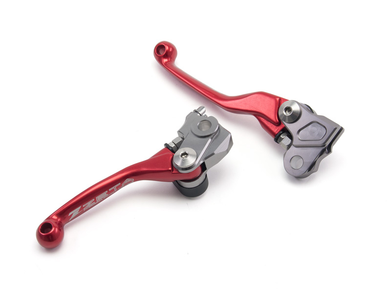 Set di leve in alluminio forgiato e anodizza to per modelli MX/Enduro. La molla di ritorno permette alla leva di piegarsiverso l'esterno evitando flessioni e rotture. Colori disponibili: rosso, blu, arancio e nero in base aimodelli di moto.