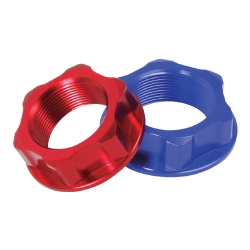 Ghiera piastra forcella e dado in alluminio anodizzato A7009-T6. Colori rosso blu arancione e nero