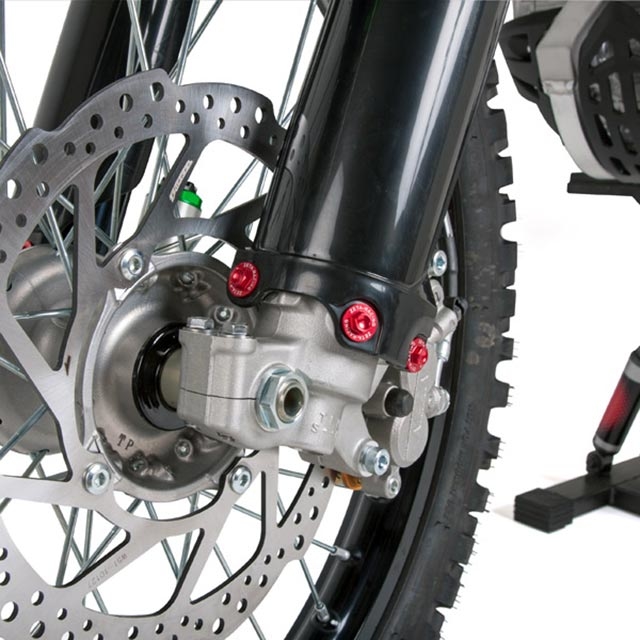 Kit specifico realizzato in alluminio alleggerito per rendere il blocco del mozzo anteriore piu' leggero.Disponibile per ogni modello non solo per le giapponesi ma anche per KTM e HUSQVARNA.