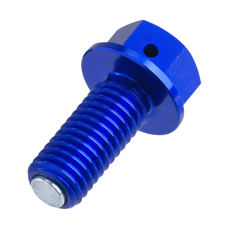 Bullone magnetico in alluminio A7009-T6 studiato per catturare i piccolipezzi di metallo nell'olio motore. Fori di sicurezza per il filo di ferro per evitare di perdere il bullone. Colori blu, rosso, arancione.