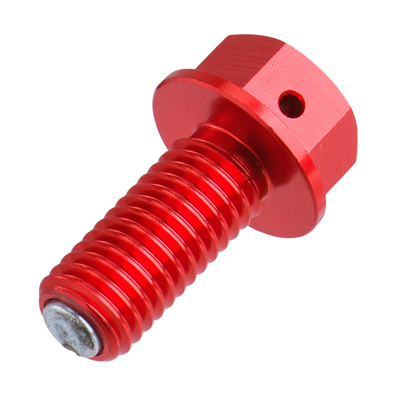 Bullone magnetico in alluminio A7009-T6 studiato per catturare i piccolipezzi di metallo nell'olio motore. Fori di sicurezza per il filo di ferro per evitare di perdere il bullone. Colori blu, rosso, arancione.